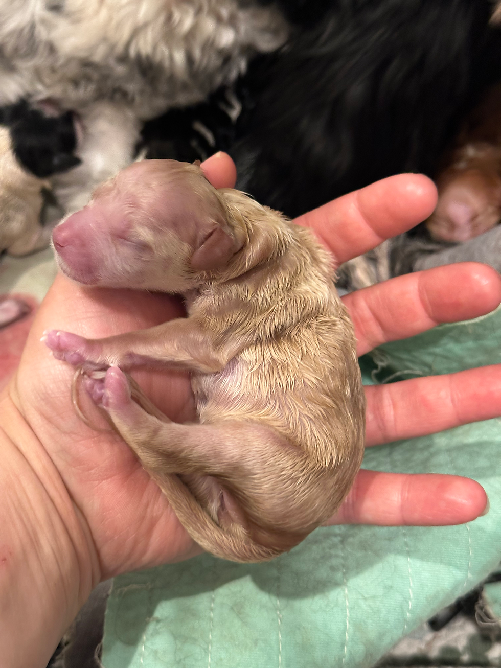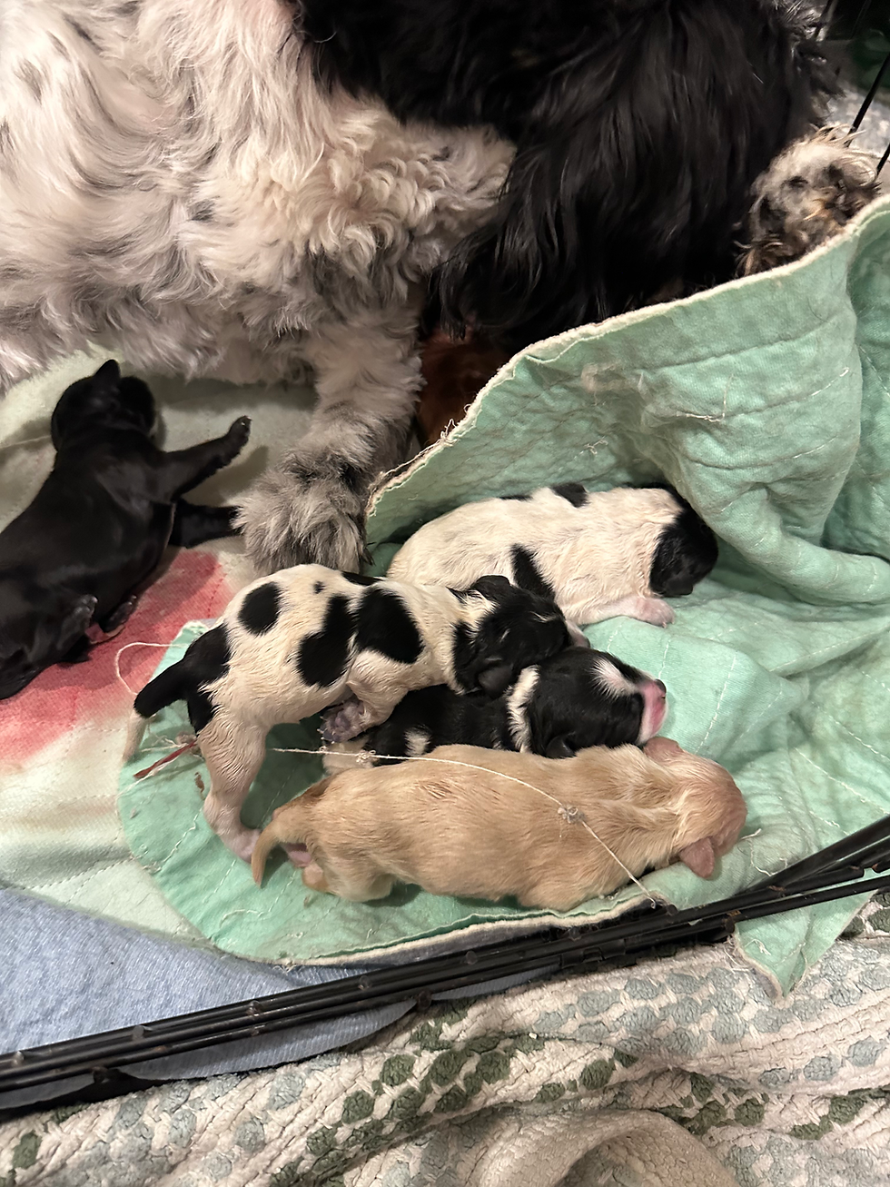 In between puppies arriving, I blowed dried each puppy to dry them off quickly so they didn't catch a chill. Once everyone had arrived, I changed out the bedding, gave Evie fresh water and some calcium, hopped in the shower, and went to bed! I was woken up bright and early at 5:00 AM by my son asking him to make him pancakes. After checking Evie and all six of her puppies (all doing well!) I got up, made my kiddos breakfast.